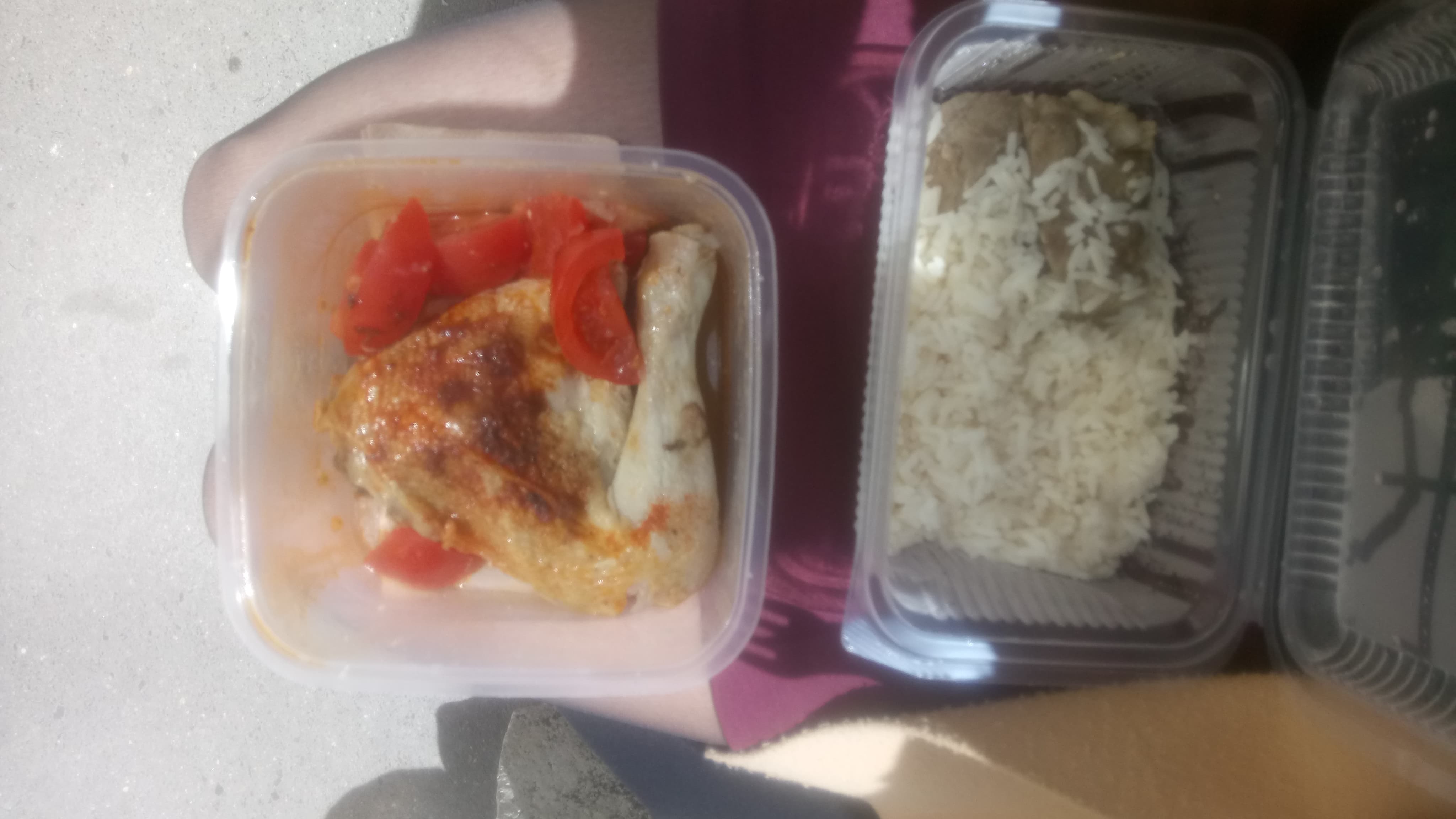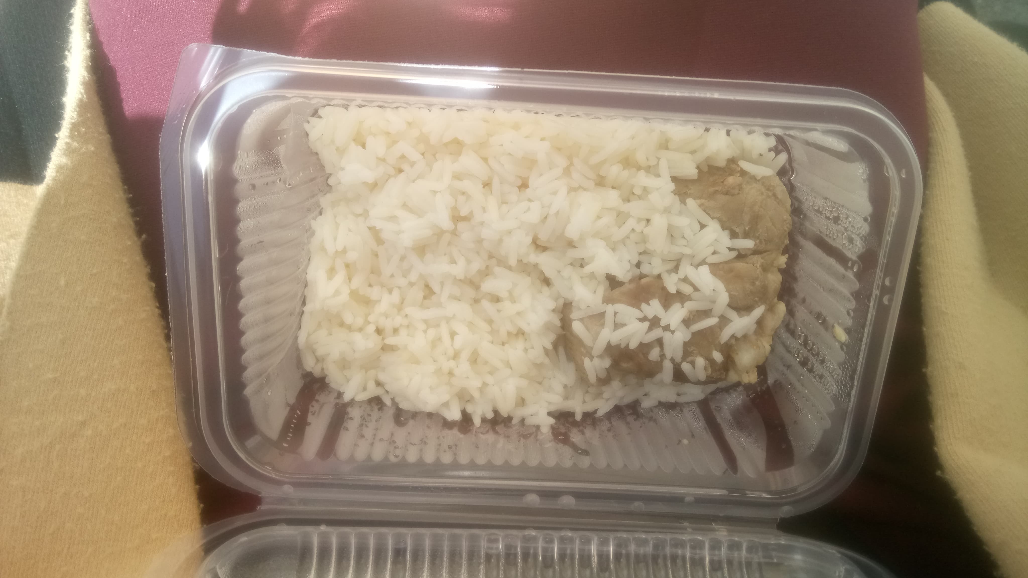 За обяд разнообразяват. Отново се предоставят два варианта- вегетариански и не. Най-често не вегетарианският се състои от варено парче пиле (не знам от коя част на пилето, което е доста впечатляващо, защото съм учила анатомия на животните) и варен ориз без никакви подправки. Срещала съм същото неидентифицирано парче пиле с картофи, което по мое мнение е по-добрият вариант.
